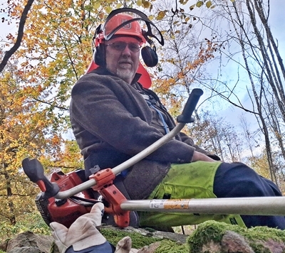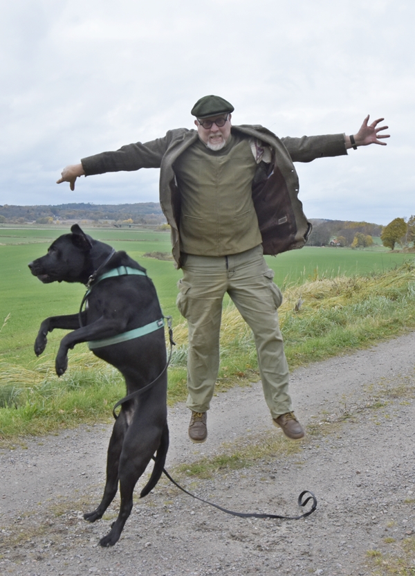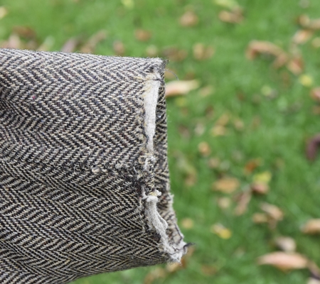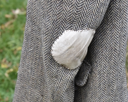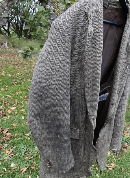 Nu är hösten här på riktigt så jag har plockat fram min ”jobbe-kavaj” i Harris-tweed för hundpromenader och sysslor på gården, t.ex. att köra röjsåg. Kavajen är verkligen sliten men jag tror att den håller en säsong till, kanske två. Jag funderar på att byta foder i den eftersom jag har foder från andra kavajer liggandes – skarvar jag lite så får jag dem att passa. Jag kollade i bloggen och jag köpte den i september 2014 på Röda Korset i Halmstad.