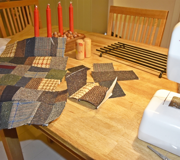 Nu när väskan är klar så har jag fortsatt sy på en väst jag började jobba på för några veckor sen. Jag syr västen av de tweedbitar jag fick av Hanna Hats