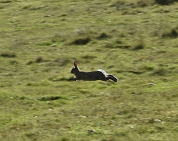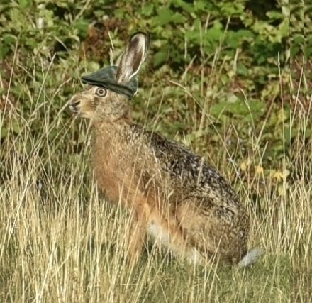 När Sigge och jag promenerade den andra vändan så skrämde vi upp en kanin. Vi försökte spåra den och efter en stund fick vi syn på en hare. Och nu ljuger jag kanske lite, men då sa vi båda ”WTF!” precis samtidig. Harar med keps ser vi ju hela tiden, men harar som har likadana kepsar som jag har, kepsar från Hanna Hats. Det ser vi aldrig!